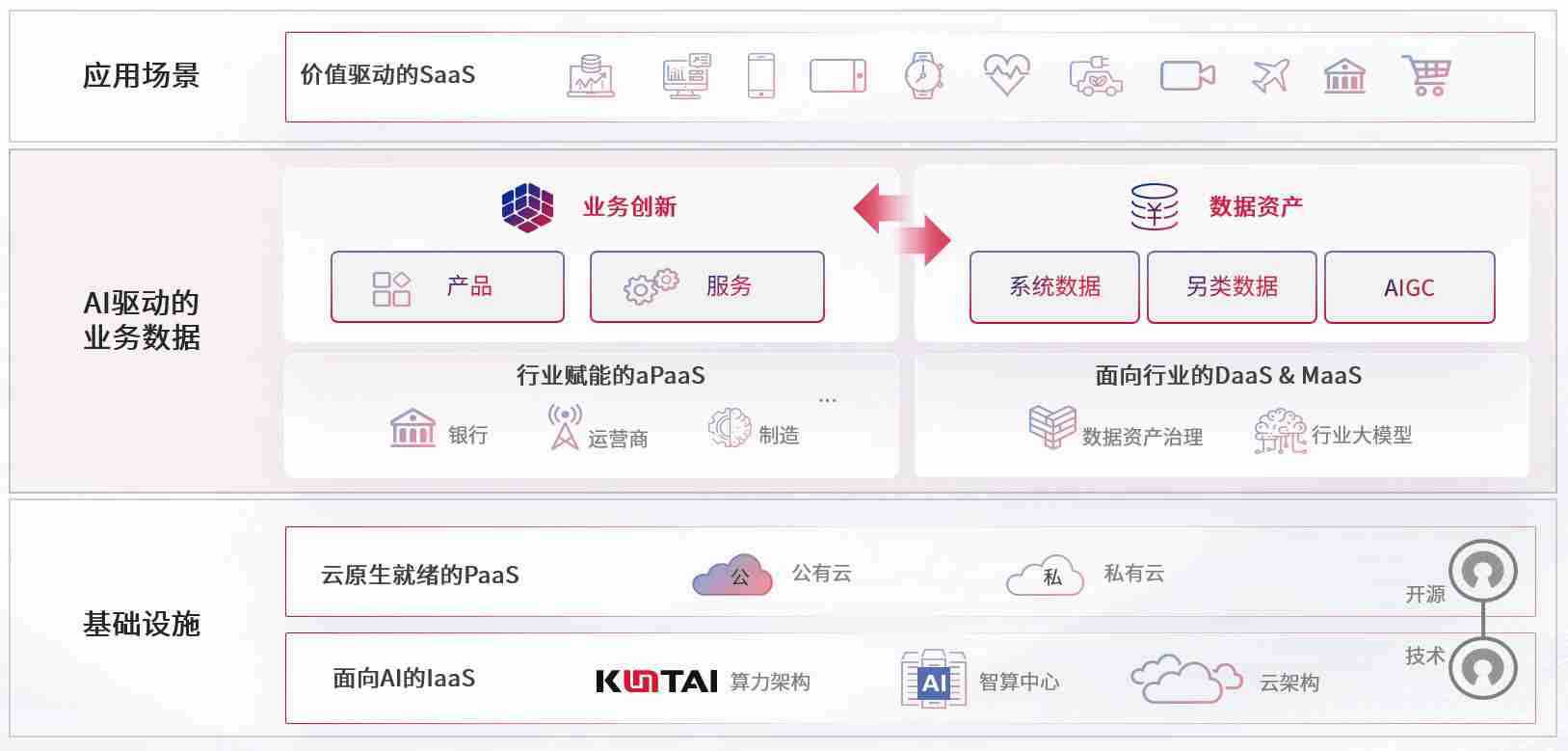 数字时代,,围绕企业数字化转型的关键要素,,AG尊龙凯时数码开创性的提出数云融合战略和技术体系框架,,,着力在云原生、、、、数字原生、、、AI原生和信创产业上架构产品和服务能力,,,为处在不同数字化转型阶段的快消零售、、、汽车、、、、金融、、医疗、、、政企、、教育、、、、运营商等行业客户提供泛在的敏捷IT能力和融合的数据驱动能力,,,构建跨界融合创新的数字业务场景和新业务模式,,,,助力企业级客户建立面向未来的核心能力和竞争优势,,,全面推动社会的数字化、、、智能化转型升级。。